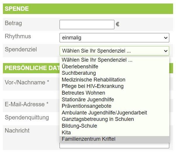 Wenn Sie die Seite aufrufen, können Sie in dem Menu "Spendenziel" das Familienzentrum Kriftel auswählen (siehe Grafik unten). Es stehen Ihnen dann verschiedene Zahlungsmöglichkeiten zur Auswahl. Selbstverständlich wird Ihnen auf Wunsch auch eine steuerlich wirksame Spendenbescheinigung ausgestellt.